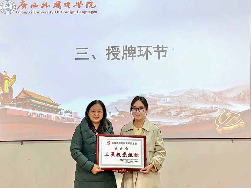为深入学习贯彻习近平新时代中国特色社会主义思想和党的二十大精神,推进基层党组织标准化规范化建设,发挥先进典型示范引领作用,会计学院党总支部于2025年12月4日中午在时习楼A201教室举行自治区级“三星级党组织”授牌仪式。会计学院党总支部书记兰丽娟同志、党总支部副书记李晶晶同志、党总支部组织委员李路同志、党总支部宣传委员兼统战委员严新钰同志、教师党支部组织委员黄湘倚同志,以及各学生支部书记、教师党员代表和全体在校党员参加仪式。仪式由包文雯同志主持。